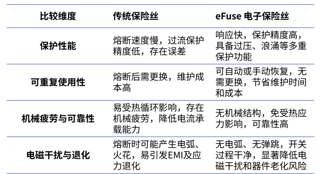eFuse(電子保險絲)是一種具備高精度電流控制和故障診斷功能的電子器件。相比傳統(tǒng)物理保險絲,eFuse支持可編程化、模塊化和更精準的熱管理能力。