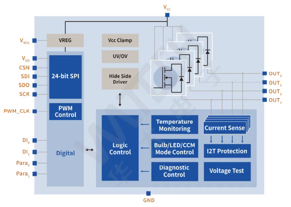 ●輸出通道狀態(tài)保持、斷開檢測與Failsafe模式支持這些機制確保在極端溫度、電流突變、硬件異常等情況下,系統(tǒng)仍可維持穩(wěn)定運行,滿足汽車功能安全標準。